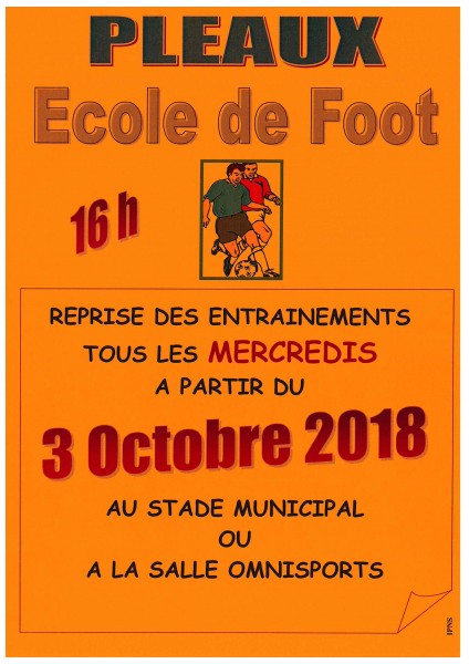 FOOT : Tous les mercredis de 16 heures à 17h15 à la salle Omnisport. Pour les 6 ans et plus. Reprise le mercredi 3 octobre 2018.