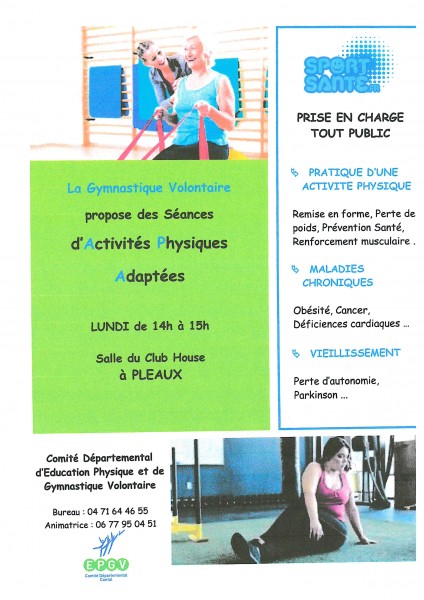 La Fédération Française d’Education Physique et de Gymnastique Volontaire vous annonce la reprise des cours de GYM ADAPTEE et de son programme GYM APRES CANCER sur la commune de Pleaux.Les séances auront lieu au Club House (salle derrière le collège) les lundis de 14h00 à 15h00 et les vendredis de 9h15 à 10h15. Les séances reprendront lundi 10 Septembre 2018 de 14h à 15h00.Venez découvrir des séances d’activité physique adapté à tout âge, à votre condition physique et votre état de santé actuel. En espérant vous retrouver nombreux et nombreuses, vous pouvez contacter l’Animatrice Marine VANTAL au 06-77-95-04-51 ou le CODEP 15 au 04-71-64-46-55 pour tous renseignements.