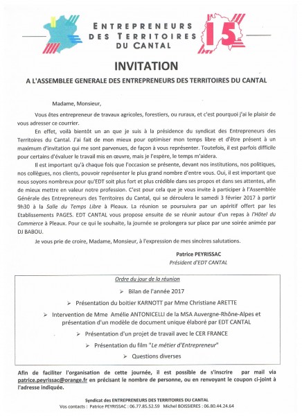 Assemblée générale du syndicat des entrepreneurs des territoires du Cantal à la Salle du Temps Libre de Pleaux présidé par Patrice PEYRISSAC à partir de 10 heures. A l'Ordre du jour : Bilan de l'année 2017, présentation du boitier KARNOTT par Christiane ARETTE, intervention de Amélie ANTONICELLI de la MSA Auvergne-Rhône-Alpes et présentation d'un modèle de document unique élaboré par EDT CANTAL, présentation d'un projet de travail avec le CER FRANCE, présentation du film «Le métier d'Entrepreneur» et questions diverses.