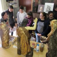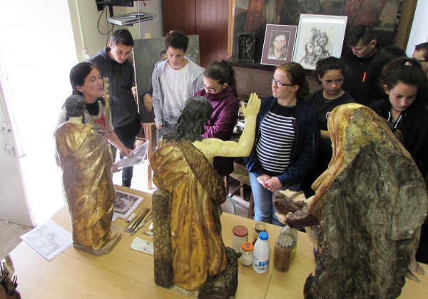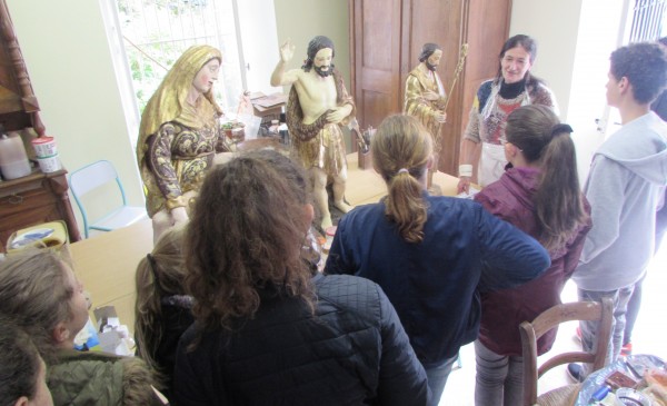 C’est dans le cadre de la construction de deux des quatre parcours éducatifs, le Parcours Avenir et le Parcours artistique et culturel, que les élèves de la classe de 4ème du collège de Pleaux se sont rendus dans l’atelier de Catherine Burguès où la restauratrice d’art travaille depuis le début de l’été à restaurer certaines statues de l’église de Pléaux ainsi que des tableaux et divers objets anciens en faïence que lui confient des particuliers. Pendant près d’une heure, la spécialiste a expliqué aux collégiens les arcanes et autres subtilités de son métier, qui est d’abord une passion, leur présentant des outils d’antan et les différents matériaux dont elle se sert pour soigner les sculptures et leur redonner leur éclat d’origine. Les élèves ont ainsi pu s’émerveiller devant une Pietà du XVIIème siècle que le temps et les hommes avaient considérablement détériorée et à qui l’artiste vient de redonner sa beauté et son lustre d’il y a quatre siècle.