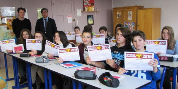 Les élèves du collège Raymond Cortat qui sont inscrits à l’option « langue régionale : occitan » viennent de participer à l’opération de la "dictada" occitane. Créée en 1998 par le centre occitan du pays castrais, l’opération connaît dorénavant un ressort particulier sur toute l'Occitanie, touchant 26 départements ainsi que le pays catalan en Espagne. Le texte choisi était un extrait des souvenirs d'Antonin Daval (1913-1992) paysan, conteur et poète de Badalhac, qui viennent de paraître aux éditions de L’Ostal del libre à Aurillac. Le principal du collège, Robert Scheuer, qui est particulièrement attaché au maintien de l’enseignement de l’occitan dans son établissement, notamment dans la cadre des « enseignements de complément » prévus par la réforme du collège qui entrera en vigueur à la rentrée de septembre prochain, est venu assister le professeur, Alban Garros, lors de la remise aux élèves participants d’un diplôme et d'un livre offert par L'Ostal del libre en guise de souvenir et de récompense.