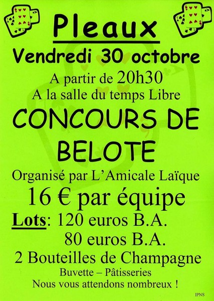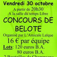Vendredi 30 octobre, 58 équipes se sont retrouvées pour taper le carton. La soirée s'est déroulée dans une ambiance très conviviale. L'amicale laïque remercie les nombreux participants et les bénévoles, et vous donne rendez-vous dimanche 8 novembre pour une bourse aux jouets, de 14 heures à 19 heures à la salle du temps libre, à cette occasion également vente de jus de pommes et châtaignes grillées. Nous vous attendons nombreux.