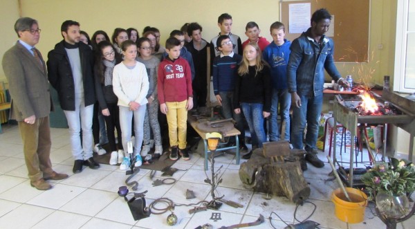 Lors de la fête du collège Raymond Cortat, organisée avant les vacances de Noël et au cours de laquelle de nombreux artistes locaux ont exposé leurs œuvres, Samba Sy, ferronnier d’art d’origine mauritanienne installé depuis plusieurs années à Longuayroux, a présenté quelques unes de ses réalisations. Ces dernières ont particulièrement plu au public et aux personnels de l’établissement, tant et si bien que, le fer devant être battu quand il est chaud, une invitation lui avait immédiatement été lancée, notamment par M. Buirette, professeur principal de la classe de 3ème, pour venir présenter son savoir-faire aux collégiens.